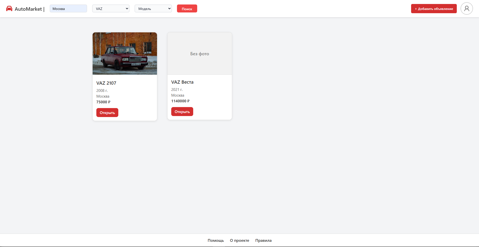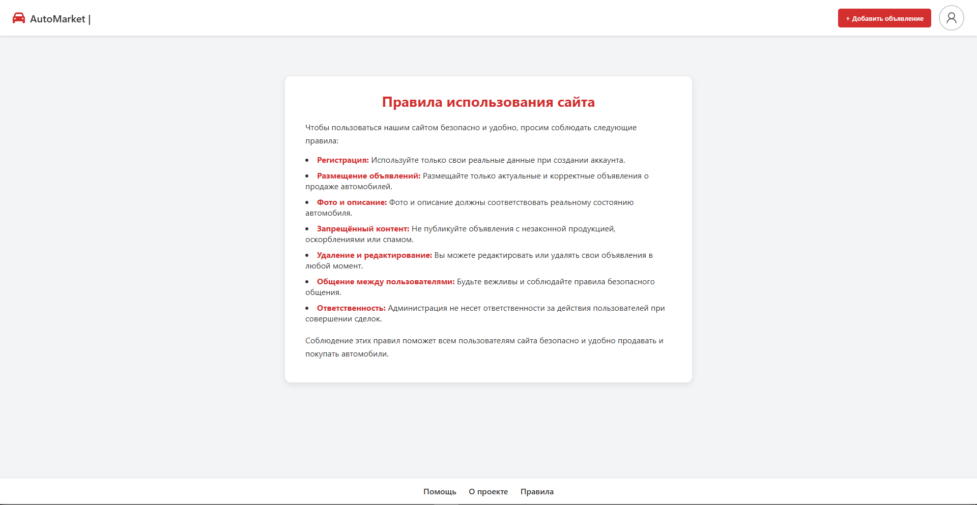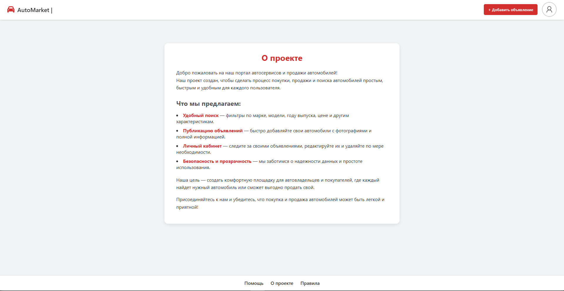 Основная цель проекта — создать удобный и понятный сервис для публикации и поиска объявлений, где пользователь может быстро разместить информацию о продаже автомобиля и так же легко найти подходящий вариант.