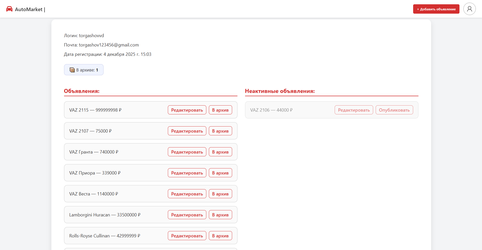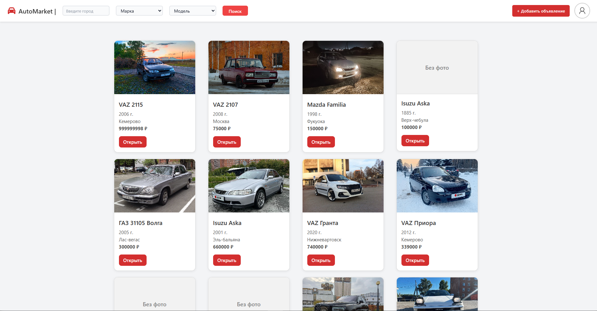 В проекте реализована полноценная система пользовательских аккаунтов: регистрация, авторизация и личный кабинет. Пользователи могут создавать, редактировать и удалять свои объявления, а также добавлять и управлять фотографиями автомобилей. Для удобства поиска реализованы фильтры и сортировка по ключевым параметрам, таким как город, марка и модель.