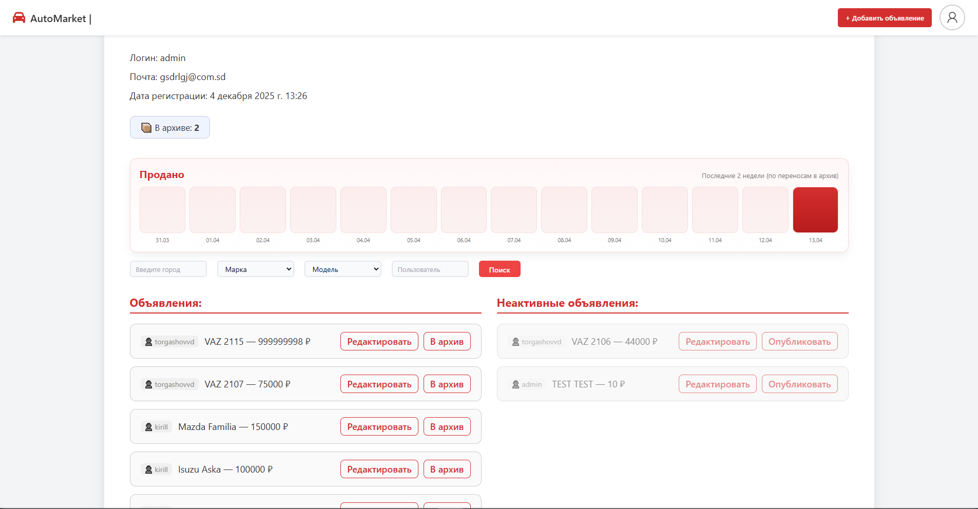 Со стороны администратора доступен функционал модерации: просмотр и редактирование объявлений, управление пользователями (блокировка и разблокировка), а также доступ к статистике по размещённым объявлениям.