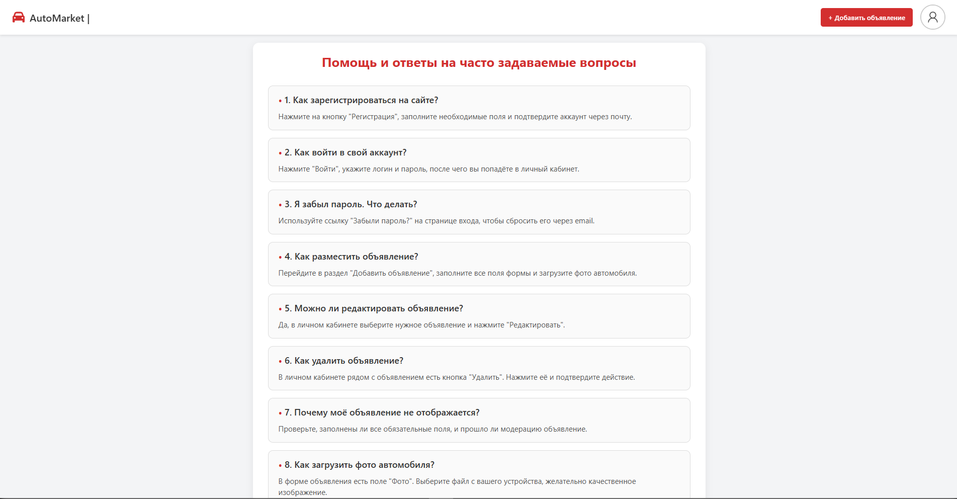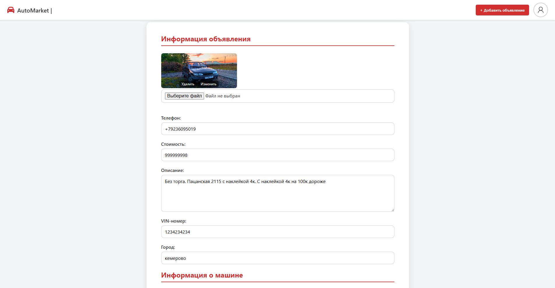 AutoMarket — это веб-приложение, позволяющее пользователям размещать объявления о продаже автомобилей и находить подходящие варианты среди опубликованных предложений. Сайт реализует удобную систему взаимодействия между продавцами и покупателями, где пользователь может быстро разместить своё объявление или подобрать автомобиль по заданным параметрам.