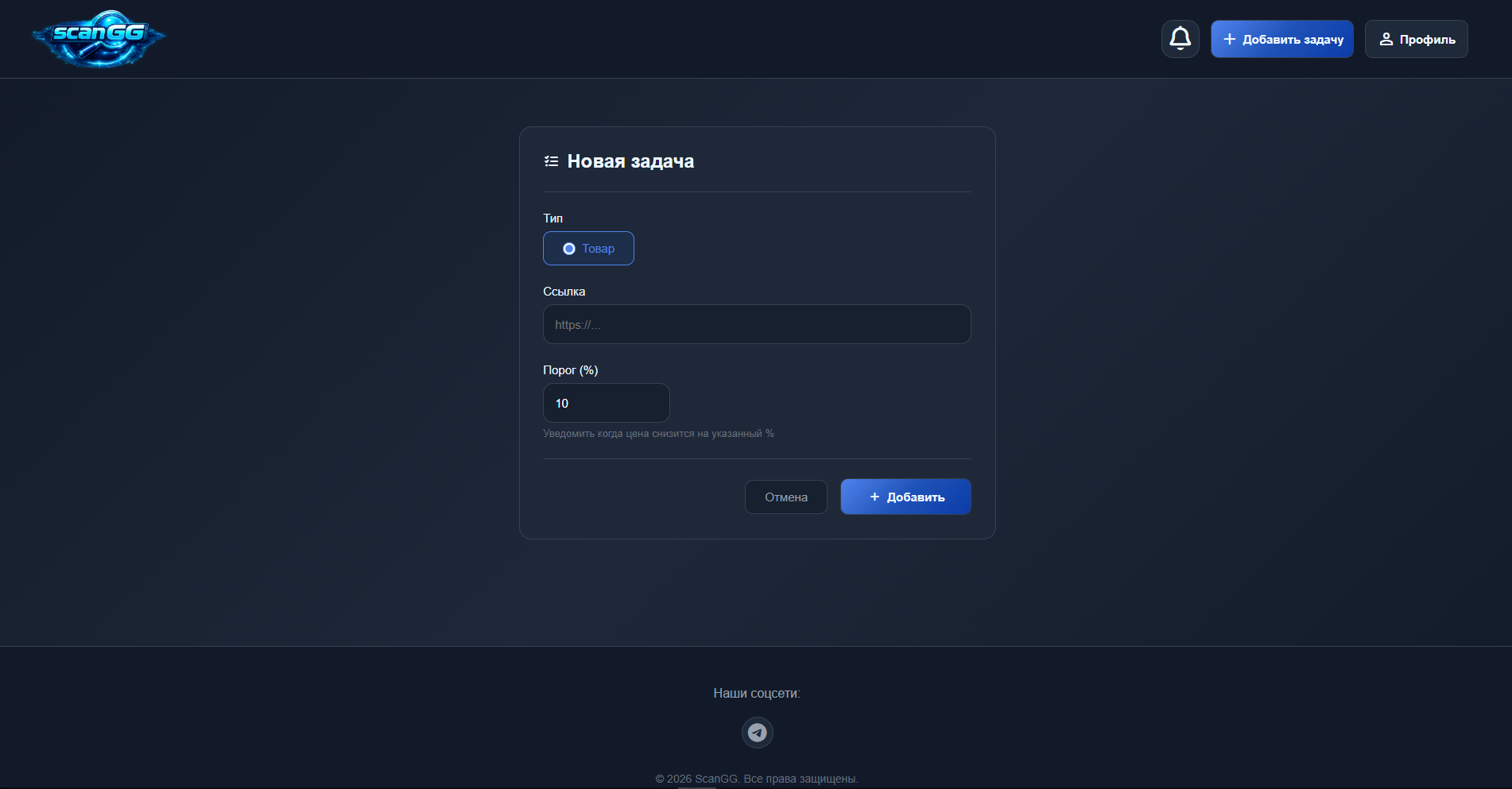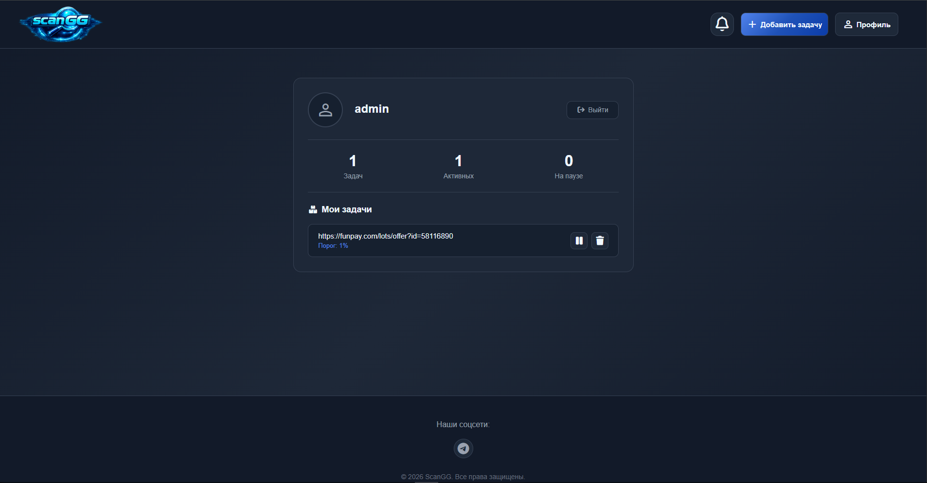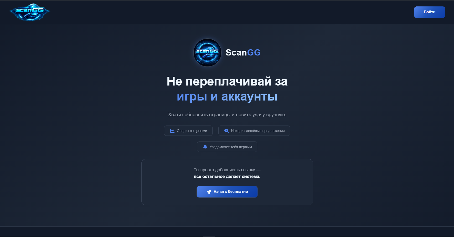ScanGG — это веб-приложение для отслеживания цен на товары с площадки FunPay. Пользователь добавляет ссылку на интересующий товар, после чего система автоматически начинает мониторинг и уведомляет при изменении цены.